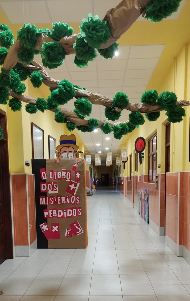 Durante cinco intensos días, se llevaron a cabo un montón de actividades y dinámicas de lo más interesantes y variadas. Todas las mañanas comenzábamos con el “Adivinapersonaje”, una dinámica donde escuchábamos por megafonía una adivinanza literaria por día que el alumnado debía resolver y apuntar en su carnet de detective. Al final de la semana se sorteó un libro entre todos los niños y niñas de la clase como premio a su participación. El alumnado de 5° y 6° estuvo leyendo hermosas historias con los niños y niñas de 1° y 2° de primaria. Siempre resulta muy motivador, tanto para los mayores como para los más pequeños de la etapa, compartir este tiempo de lectura juntos. También encontramos en un pasillo un libro gigante llamado: «El libro de los misterios perdidos». Las niñas y niños de toda la etapa tuvieron que llevar a cabo diferentes actividades que fueron distintas y variadas según el curso: elaboración de dibujos misteriosos, redacción de mensajes secretos e invención de detectives literarios. Todo esto tuvieron que pegarlo en las páginas del libro gigante, que quedó muy, muy misterioso gracias a la colaboración de todo nuestro alumnado de primaria.